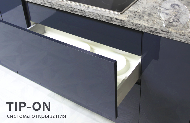 Открывание по нажатию доступно в корпусах с распашными фасадами, а также для тех, в которых присутствуют ящики.